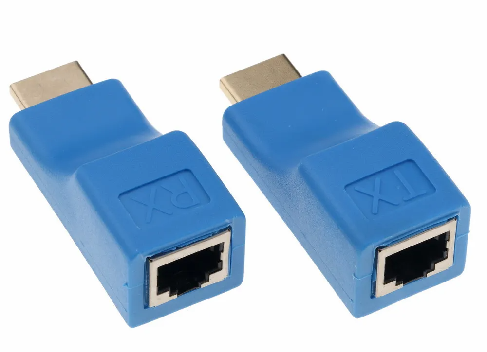 별도의 장치 없이 랜케이블을 HDMI로 단순 변환시켜주는 제품이다. 거리가 길지 않을 경우 (15미터 내외) 일때 유용하게 사용할 수 있고, 해상도가 그리 높지 않은 경우에 사용하면 효과적이다. 단순히 HDMI 변환 잭만으로 전송이 되는 것이기에 별도의 기기 설정이 필요 없으나 고해상도, 특히 4K에서 이 방법을 적용하려는 것은 정말 손안대고 코풀려는 놀부심보에 가까운 행위다. HDMI 1.4 규격을 만족하는 제품들이 대부분이나, 저렴한 제품들 보면 HDMI 1.3 제품도 있다. 그리고 HDMI 1.4라고 표시되어 있어도 1.4 규격을 제대로 만족 못하는 경우도 있으니 HDMI 규격 표시 되어 있다고 곧이 곧대로 믿으면 안되겠다.