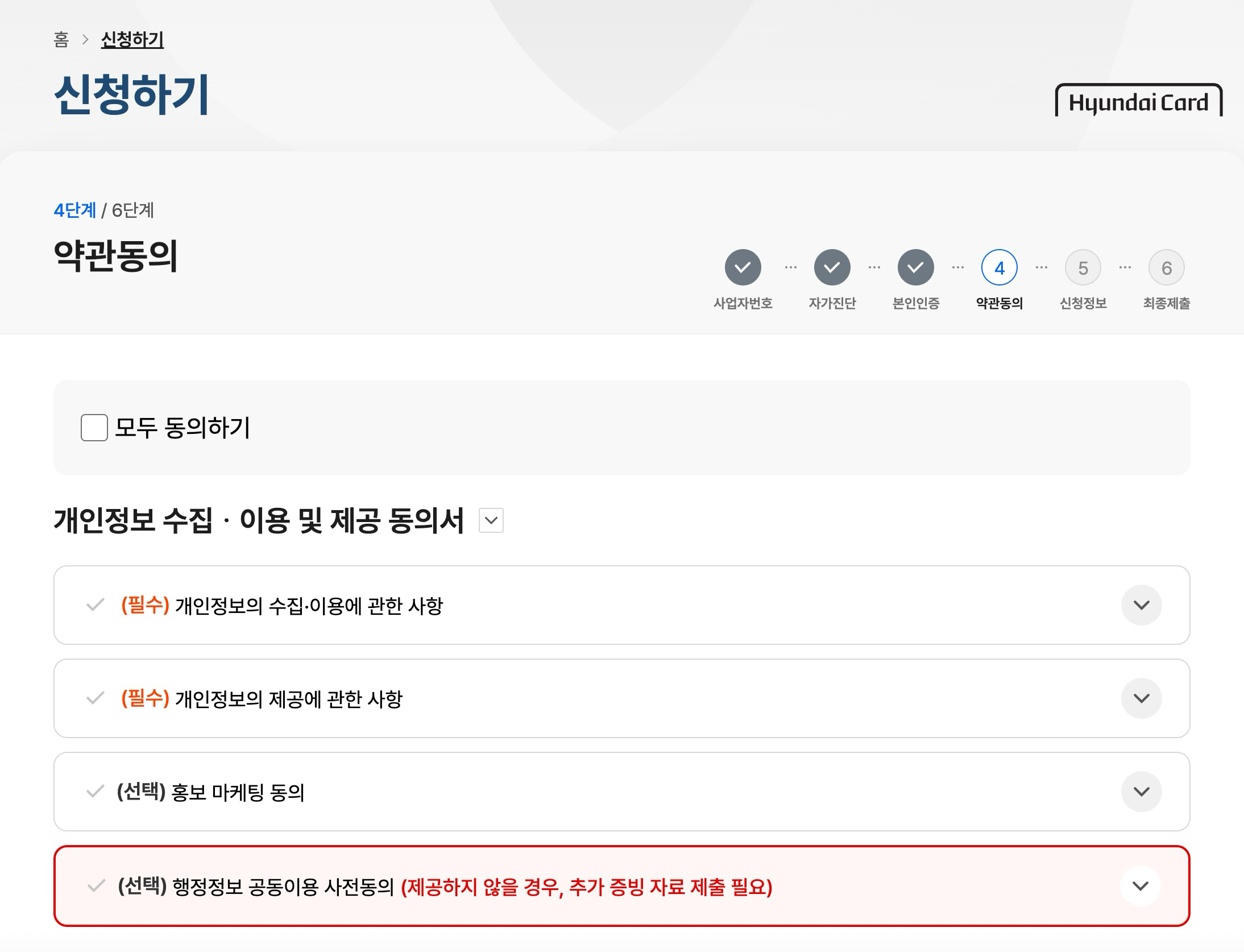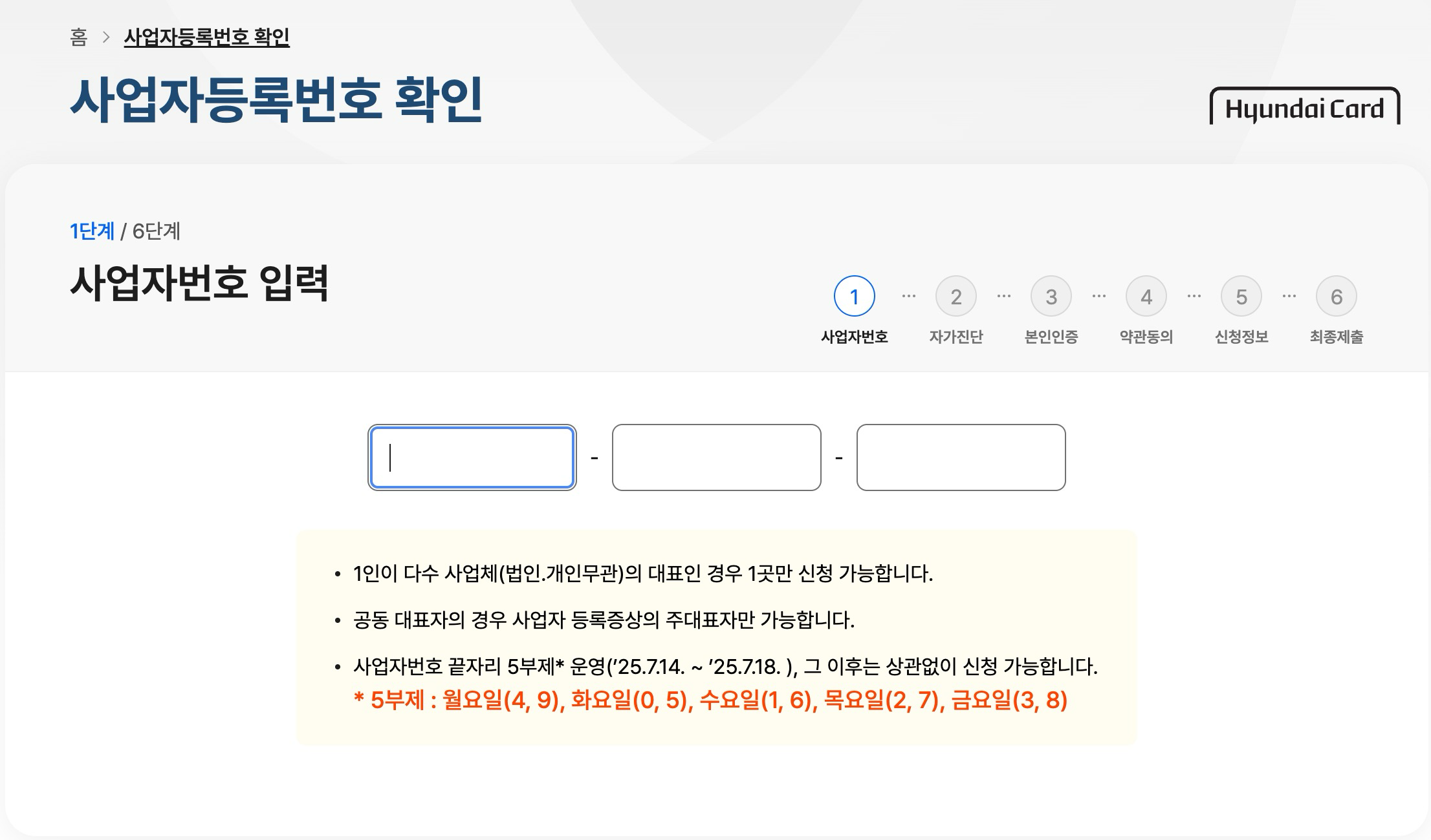 저는 현대카드를 골랐습니다. 아래와 같이 화면에 사업자번호를 입력하게 됩니다.