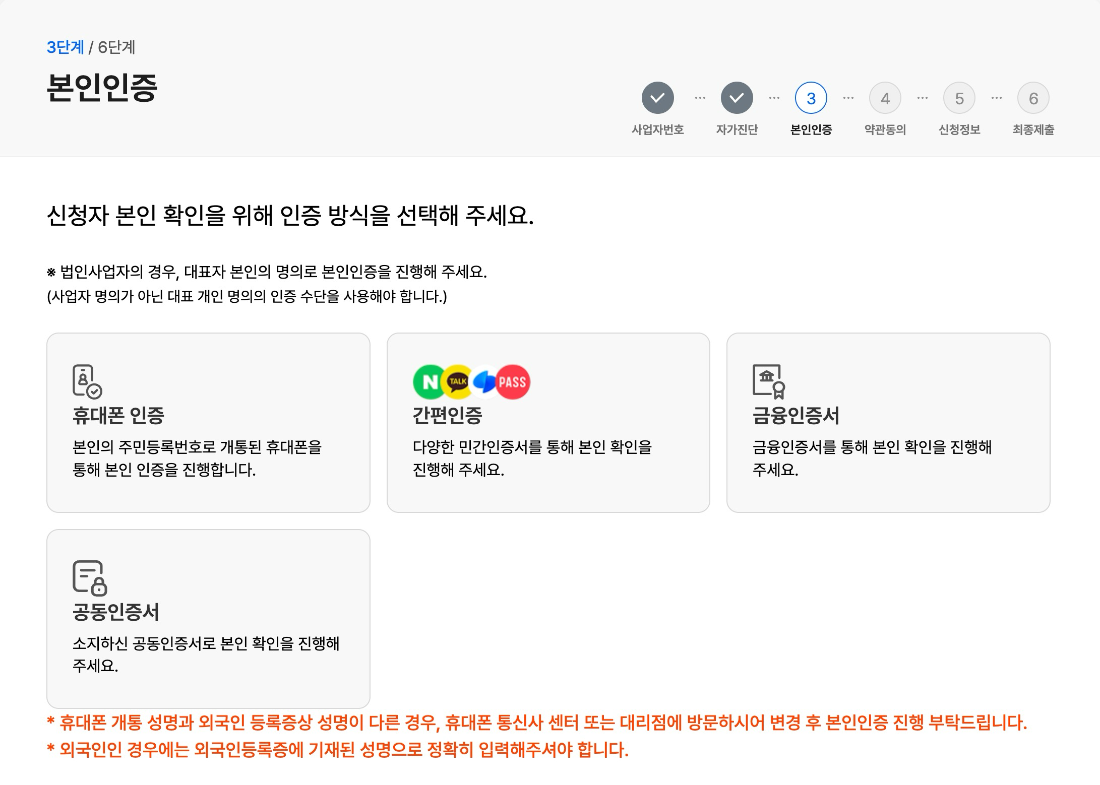 이후 본인인증을 위한 화면이 나옵니다. 사업자 대표가 아닌 다른 사람이 할 수 없는 구조가 여기서 나옵니다. 익숙한 본인인증을 선택하셔서 진행하시면 됩니다. 보통 간편인증 많이 하니 저도 그것으로 하겠습니다.