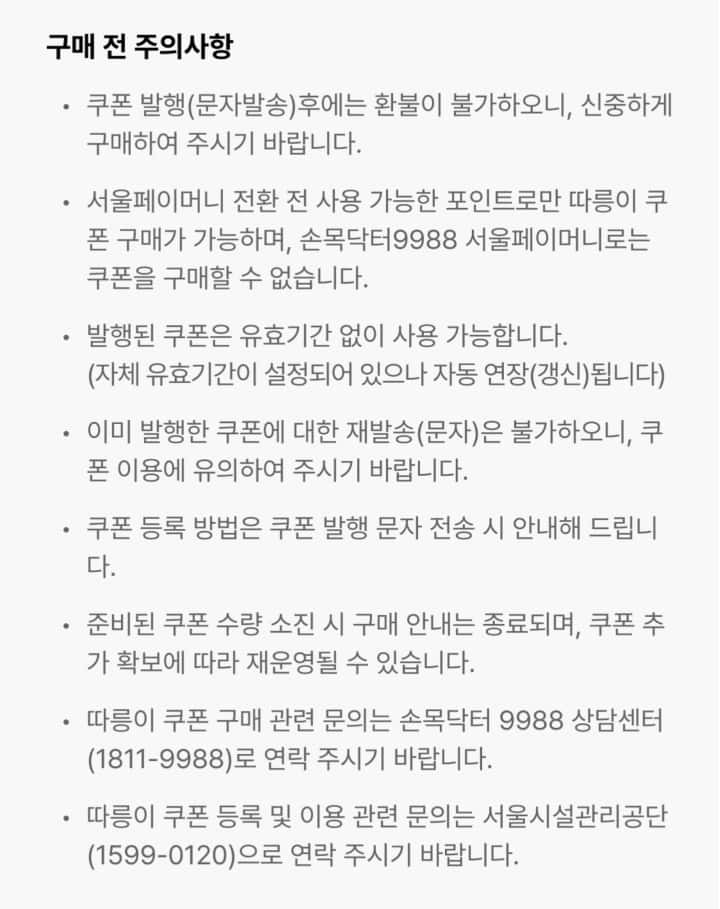 아래에 나와있는 구매전 주의사항을 확인하셔서 따릉이 쿠폰을 구입하시기 바랍니다. 제가 보기에 가장 중요한 사항은, 서울페이로 전환 전에 따릉이 쿠폰을 구입해야 한다는 것입니다. 서울페이머니로는 따릉이 쿠폰 구입이 불가능 하니까요!