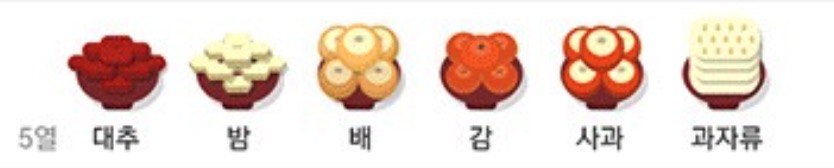 • 왼쪽부터 대추, 밤, 배. 감, 사과, 과자류로 배치됩니다.
