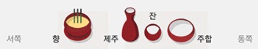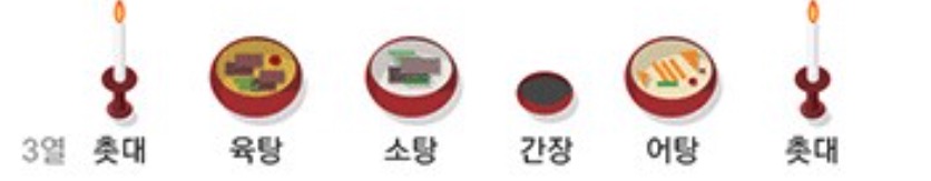 • 잔대(술) - 떡국 - 시접(수저) - 신위(지방) - 떡국 - 다시 잔대의 순으로 놓습니다.