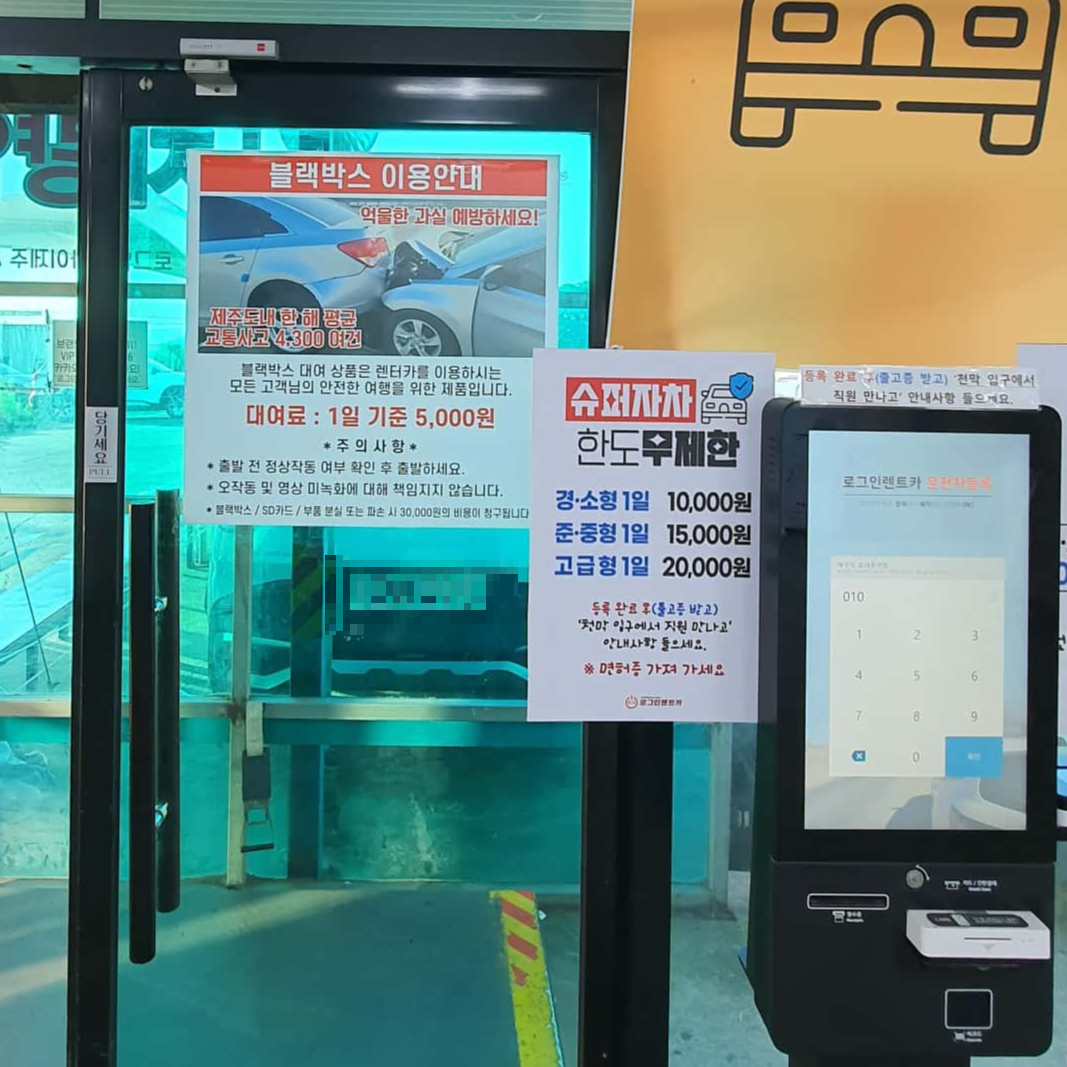 이게 제일 좀 황당했는데, 렌터카라면 렌터카 업체가 자신들의 차를 보호하기 위해서라도 블랙박스를 의무적으로 장착하지 않을까 생각했거든요? 그런데 블랙박스가 1일 5천원으로 대여한다는 얘기에... 어느 업체에서도 겪어보지 못한 옵션이라 뭐 이런것을 생각하지 못했다 등의 수준이 아닌, 그냥 좀 말이 안나오는 부분이더군요. 물론 15,000원을 3일간 지불해도 저렴한 렌트비니 그냥 대여하긴 했지만, 이 부분 감안해서 서울에서 블랙박스 카메라를 가져오시던가, 아니면 고프로 등의 액션캠을 임시로 활용하셔서 블랙박스로 대체하시길 권합니다.