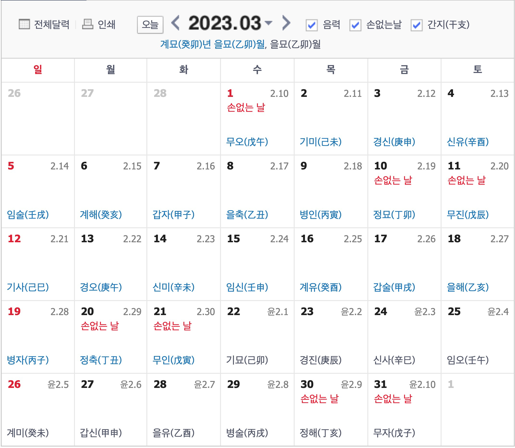 2023년 3월 손 없는 날 달력