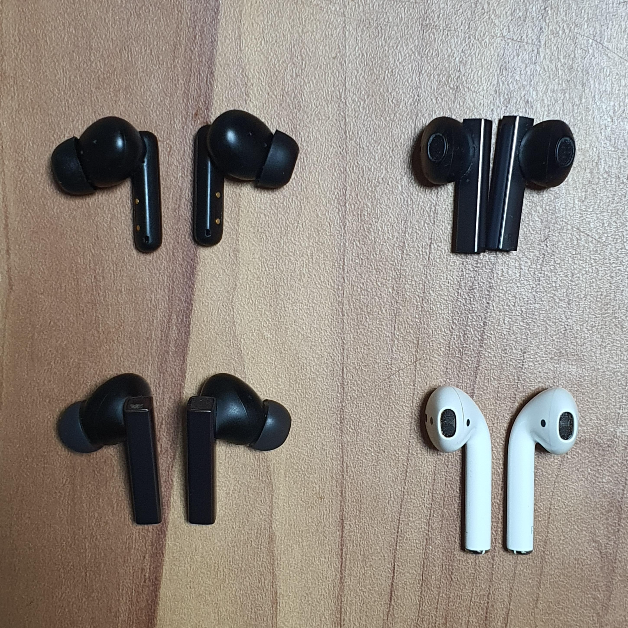 무선이어폰 이어버드 크기 비교, QCY T13 ANC(좌상),   CC NANO(우상), FIIL CC PRO2(좌하), 애플 에어팟2(우하)