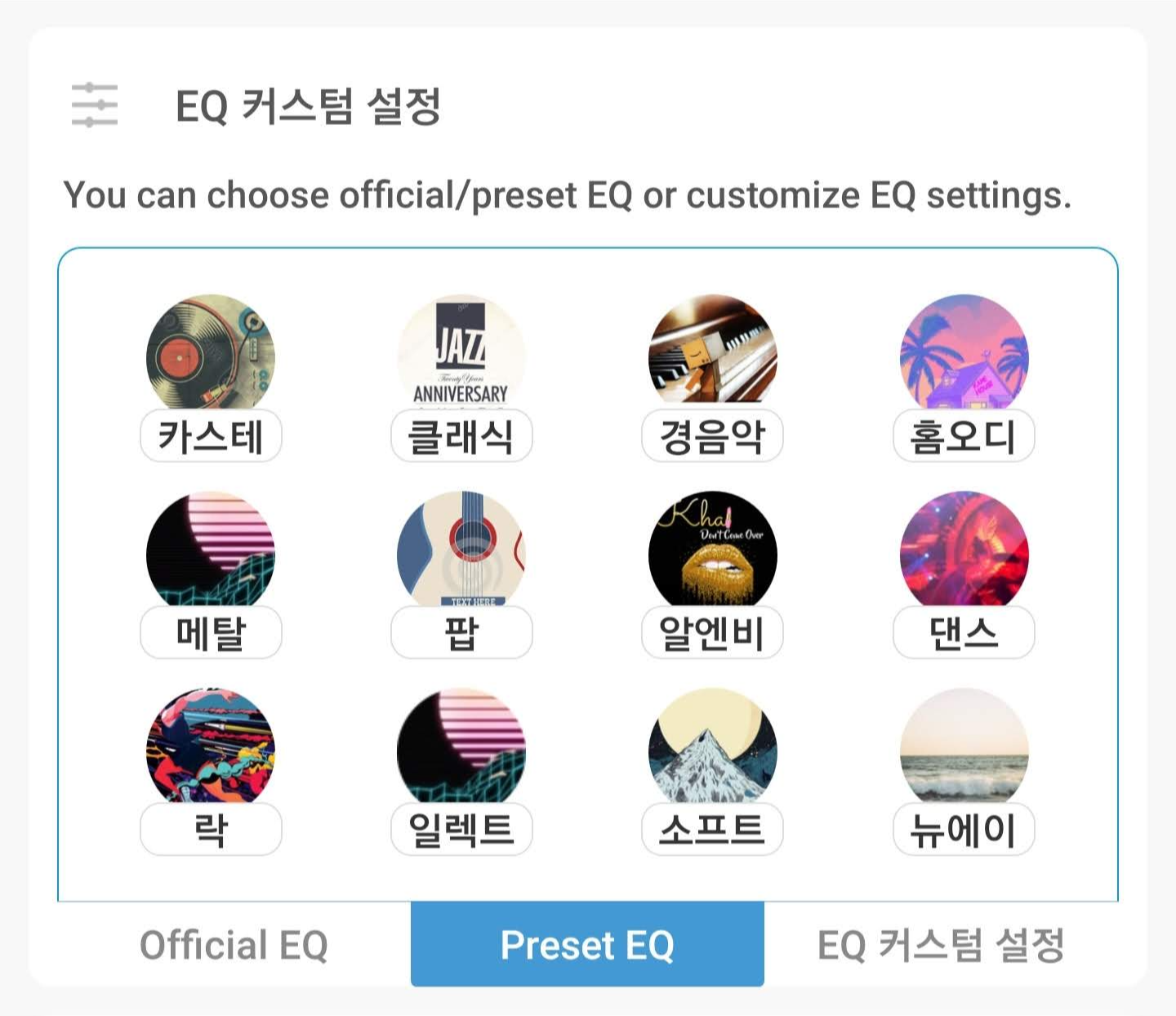 그리고 아래 그림처럼 여러 프리셋들이 있어 장르별로 세팅도 가능하며, 전통적인 10밴드 이퀄라이저도 EQ 커스텀 설정에서 사용할 수 있습니다.