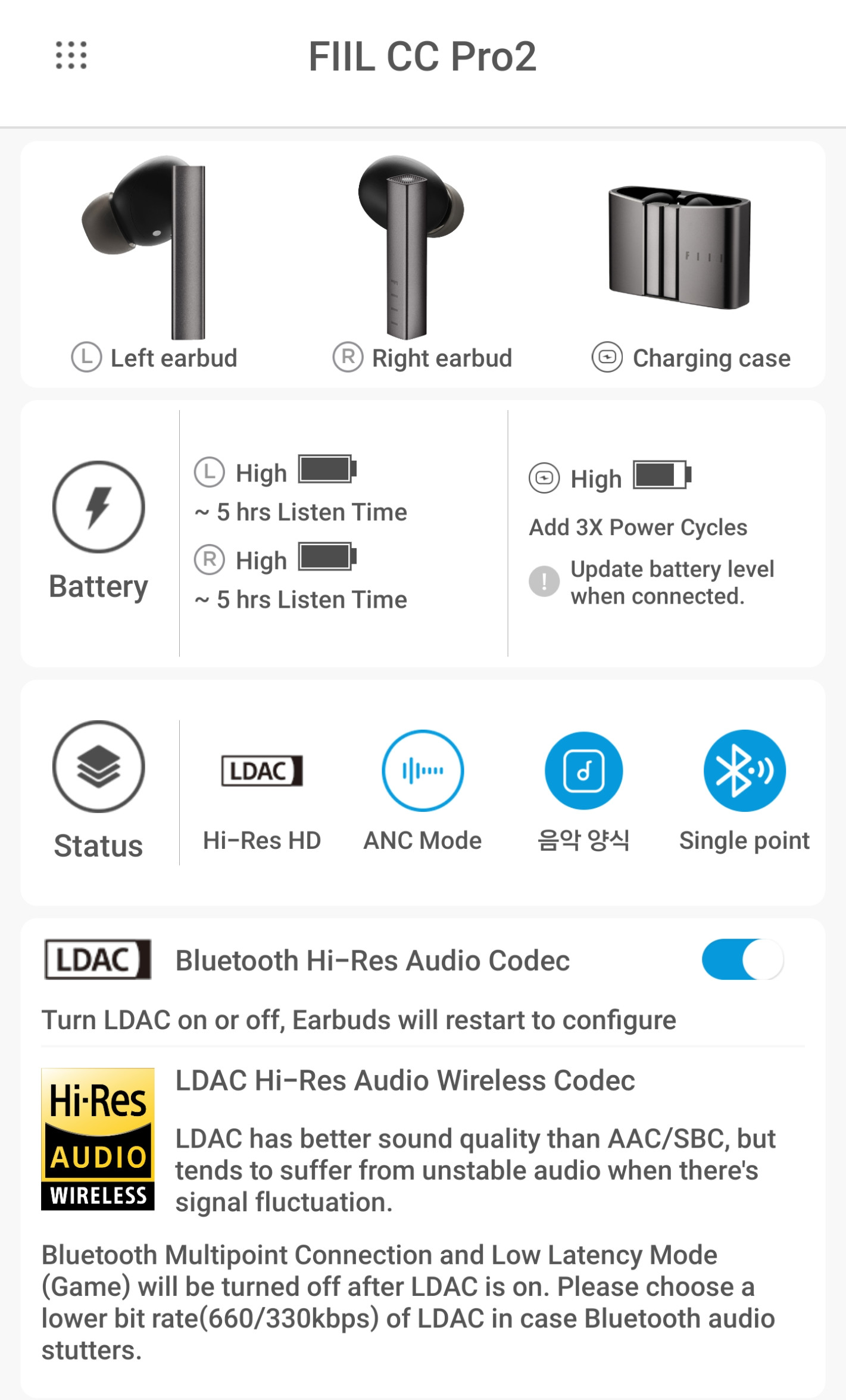 이후에 음질 면에서는 LDAC와 AAC를 설정할 수 있는데, LDAC로 연결하면 660kbps의 많은 데이터로 고해상도의 음악을 들려주는다는 설명을 하지만, 저지연 모드, 멀티포인트 연결 모드를 사용하게 되면 LDAC는 자동적으로 꺼진다고 설명 되어 있으니 이 부분은 꼭 알아두시기 바랍니다. LDAC는 여기서 활성화 하고 안드로이드 본체의 블루투스 메뉴 해당 FIIL CC PRO2 연결에 들어가 LDAC를 활성화 시켜주셔야 LDAC로 동작한다는 점도 꼭 잊지 마시구요.